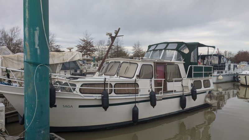 Intérieur : cabine arrière lit double, wc et douche, penderie, timonerie avec banquettes, coin cuisine avec table transformable lit, pointe avant lit en V ou complet
